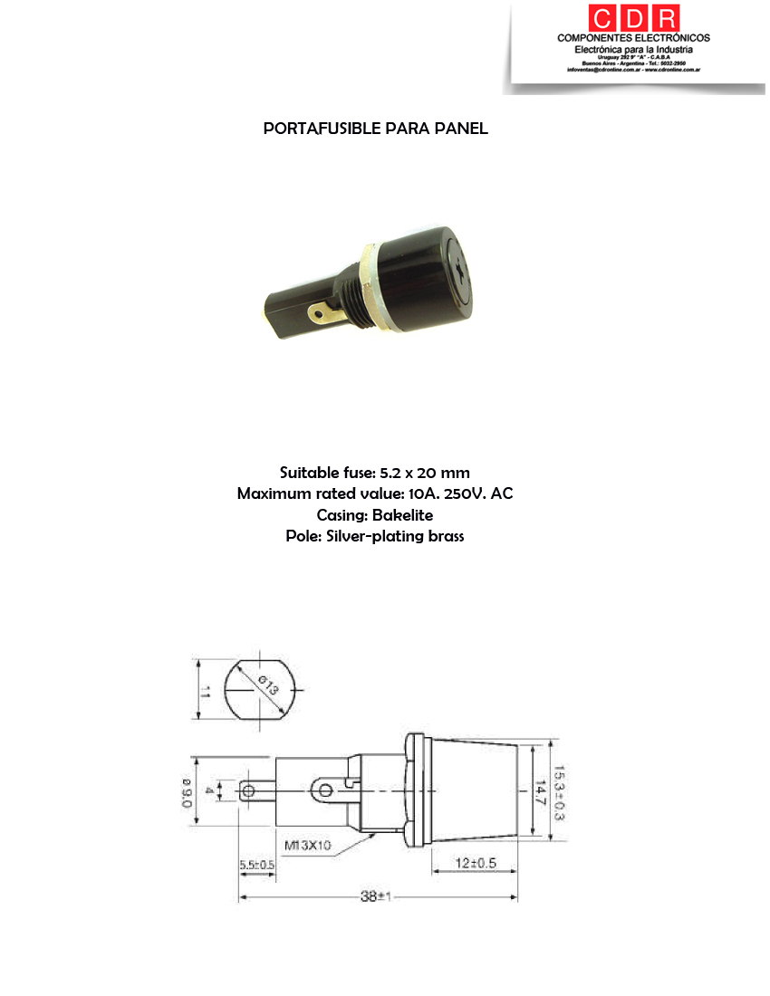 PORTAFUSIBLE P/PANEL 20X5MM C/MUESCA 10A 250V